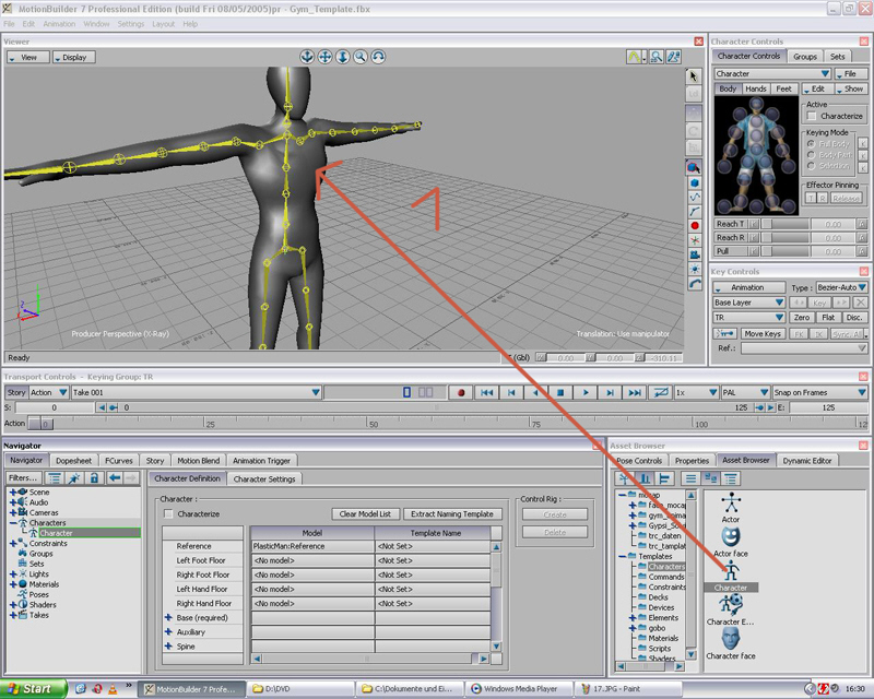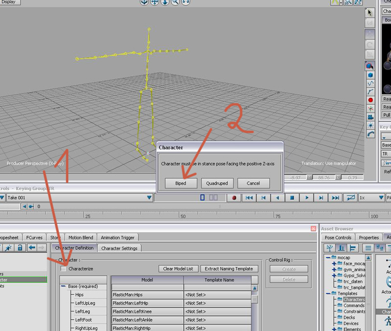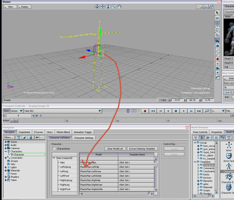 Wie schon bei den trc -Dateien, selektiert Ihr einen joint, und zieht diesen mit gedrückter alt -Taste in die zugehörige Spalte. Z.B. Eure Hüfte zu hips, Euer linkes Bein in LeftUpLeg u.s.w;
